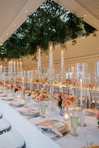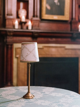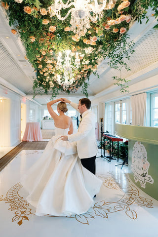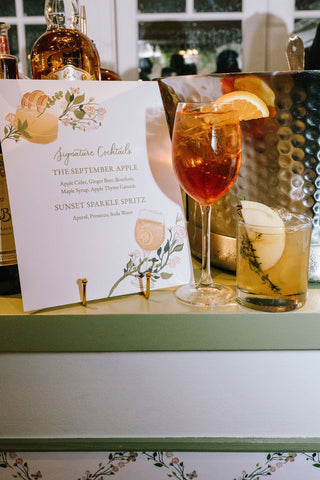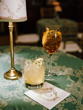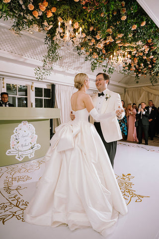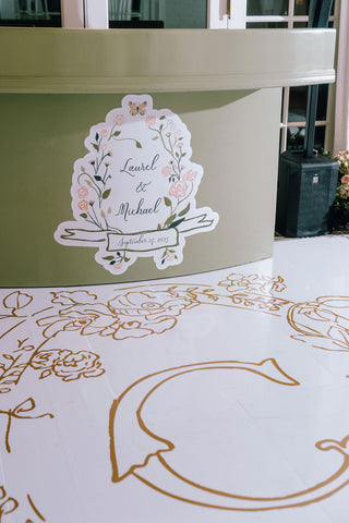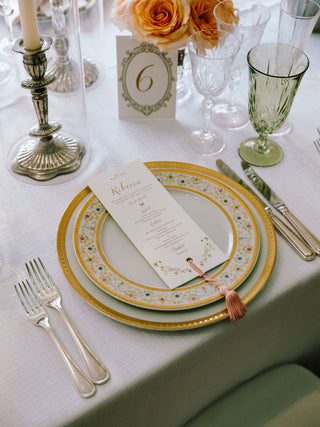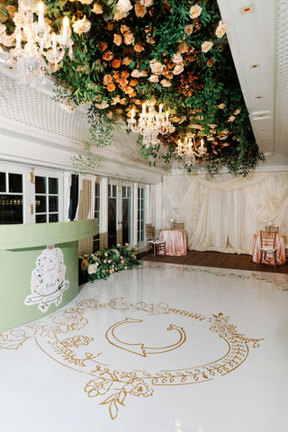 The wedding branding was thoughtfully woven into every detail of the celebration, creating a truly immersive gilded garden experience. Custom logos adorned the dance floor, while a bespoke trellis pattern wrapped the lampshades and lined the bar, and the crest from the save the date reappeared throughout the signage for a beautifully cohesive look. From the elegant wayfinding to the tassel and gold grommet menus, every touchpoint reflected the bride’s romantic, gilded garden vision with intention and artistry.