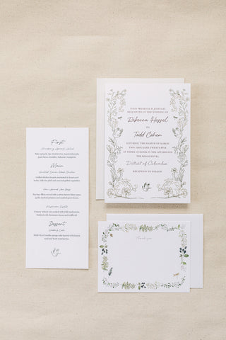 The invitation suite set the tone for the entire elopement. Intricate botanical illustrations and delicate birds were woven throughout the design, creating a layered, heirloom-quality aesthetic. The artwork felt organic yet elevated — detailed without overwhelming the clean, classic typography.