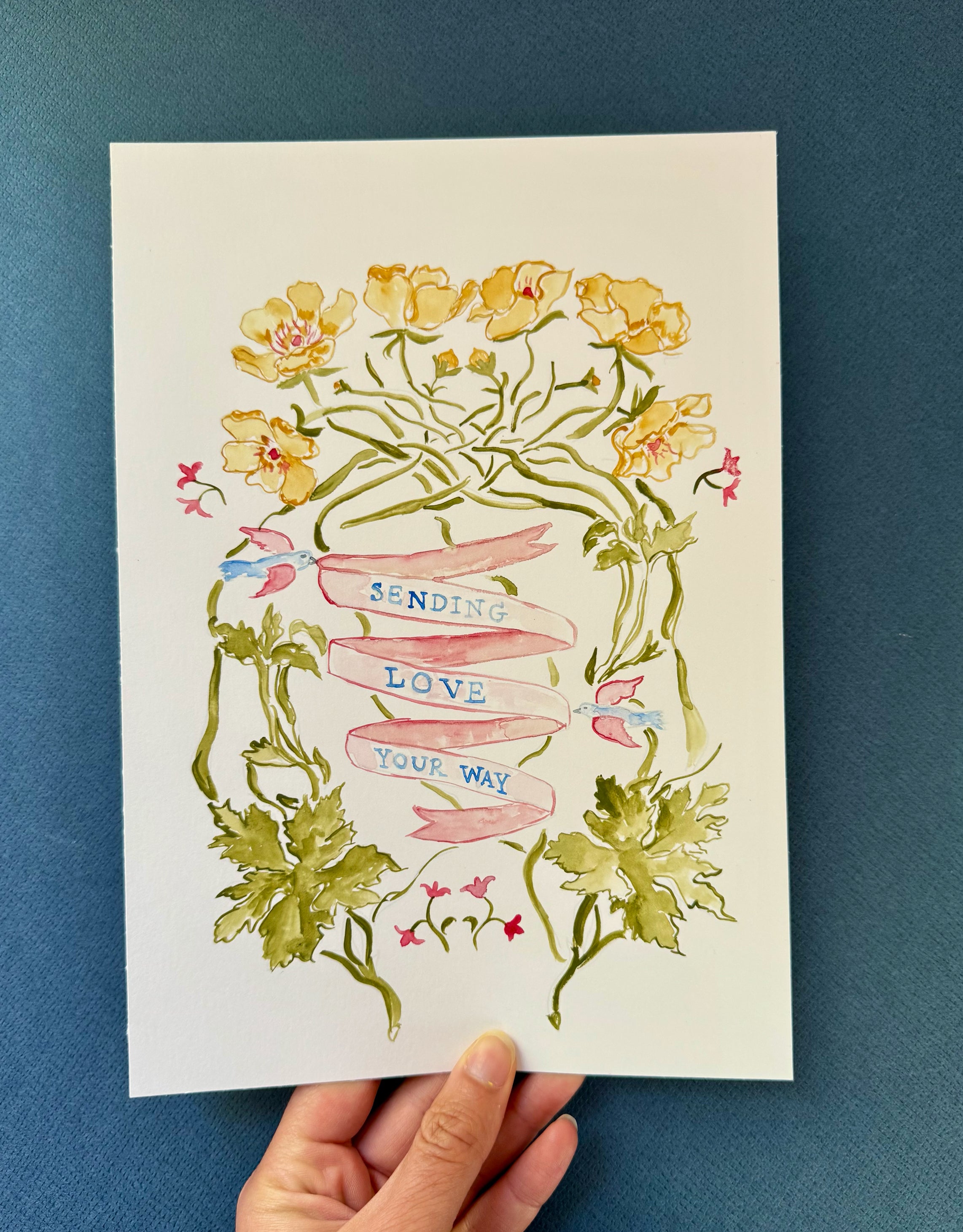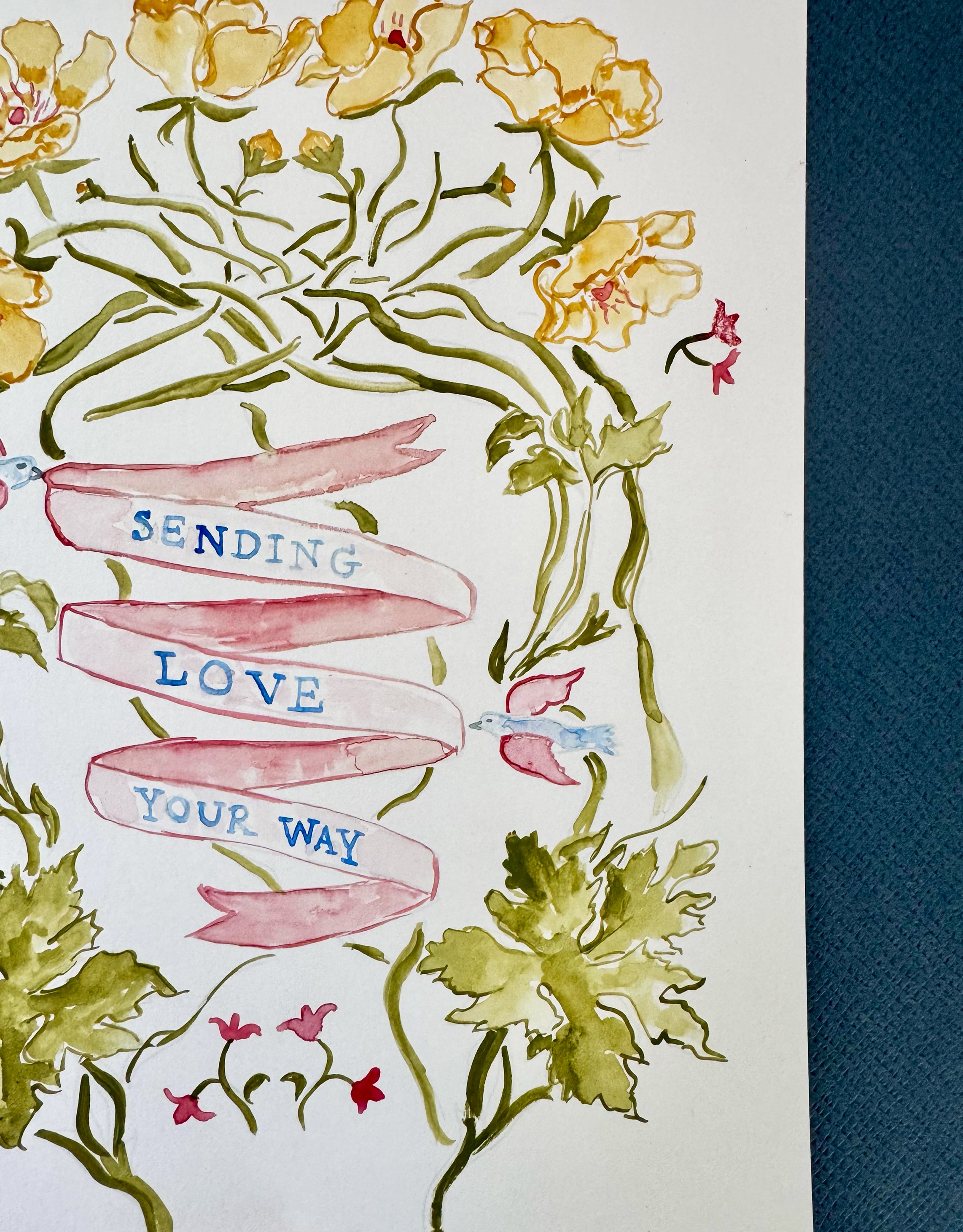 An original 8×10 watercolor painting inspired by florals and folk art. This watercolor piece is meant to inspire you to send light and love to those in need. Whenever I have a friend or loved one going through a hard time, I often say sending love your way, which inspired this piece. Art by Elizabeth Bloom®